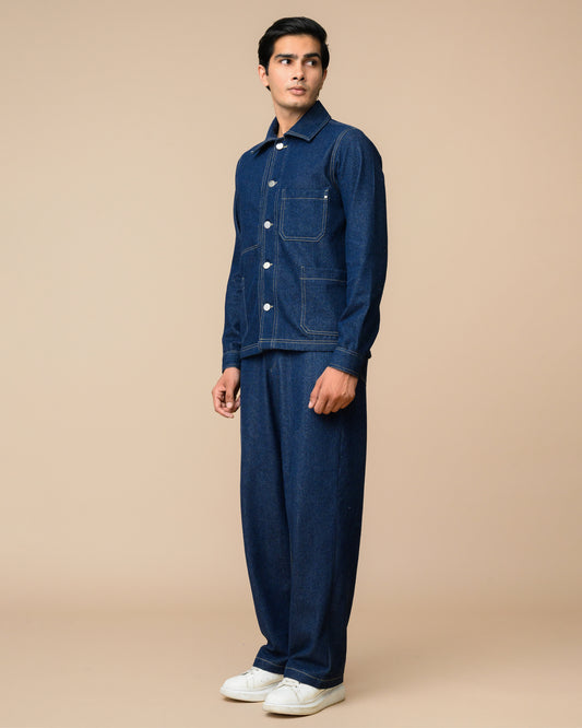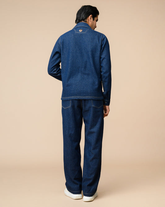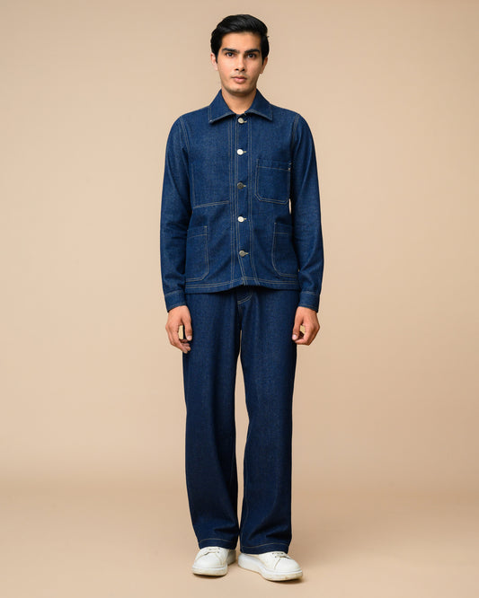 A structured full-sleeve denim shirt with triple utility pockets, metal button closure, and bold contrast stitching. Minimal in styling, powerful in presence.